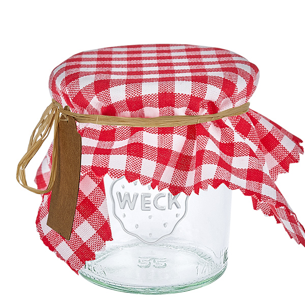 Gebruik de stoffen deksels om WECK-, schroef- en klempotten te versieren. Ideaal om zelfgemaakte jam of ingemaakte groenten en fruit cadeau te geven.