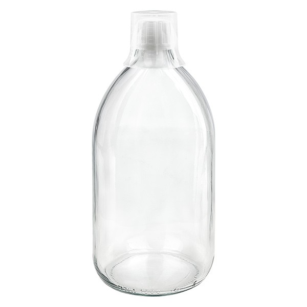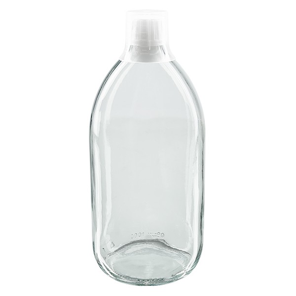 1000 ml Euro-medicijnflessen helder met witte schroefsluiting en doseerbeker 30ml