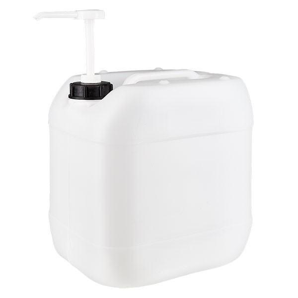- Beschrijving: Deze blanke jerrycan is geschikt voor levensmiddelen en makkelijk te vullen. Als sluiting wordt een doseerpomp meegeleverd. Met praktisch handvat.