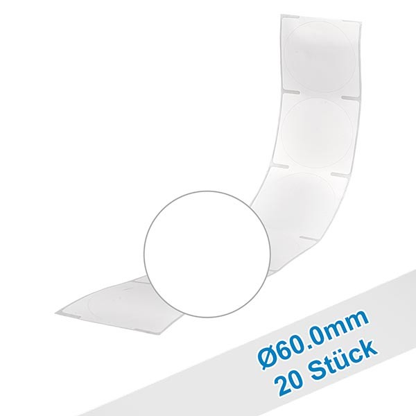 20 etiketten, wit, verwijderbaar 60mm, rond. Zeer gunstige kwantumkortingen al vanaf 4 stuks.