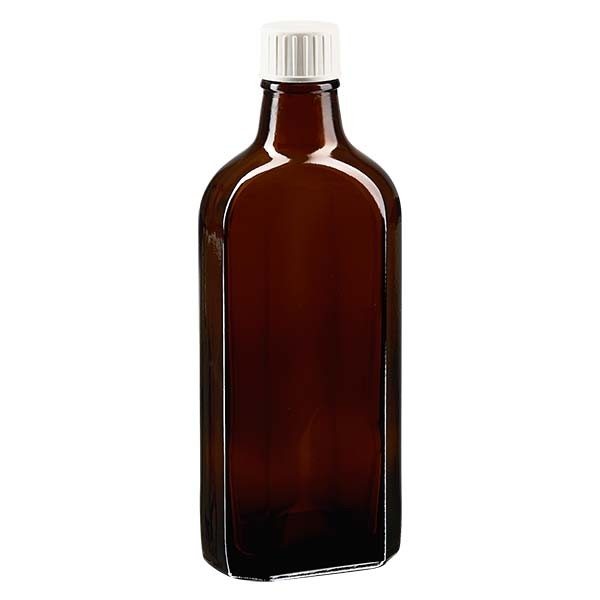 200 ml bruine meplatfles met DIN 22 monding, inclusief schroefsluiting DIN 22 wit met PE-schuiminzetstuk