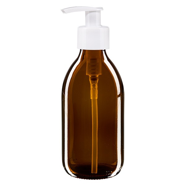 - Beschrijving: Van medisch glas klasse III. De bruine flessen in gedrongen veral flessenvorm beschermen de inhoud effectief tegen licht. Geschikt voor levensmiddelen. Inclusief witte dispenserpomp.