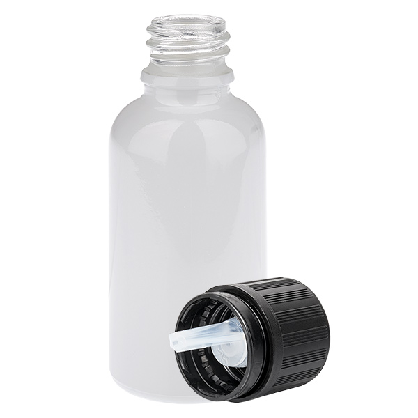 - Apothekersfles met 18 mm schroefdraad (UT18). Compleet met druppelsluiting.