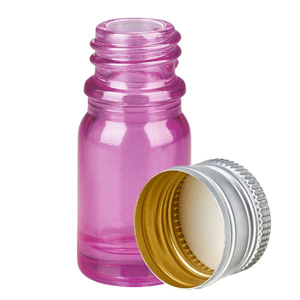 Hoogwaardige 5 ml fles PurpleLine van glas met UT18/5 schroefdraad en 11 mm schroefdop in aluminium-zilver standaard. Ideaal voor monsters, essences en cosmeticaproducten die zowel functioneel als visueel aantrekkelijk gepresenteerd moeten worden. De elegante zilveren look geeft de fles een moderne en hoogwaardige uitstraling.
