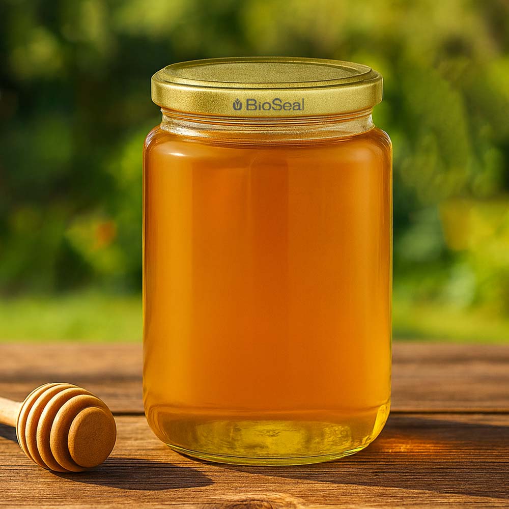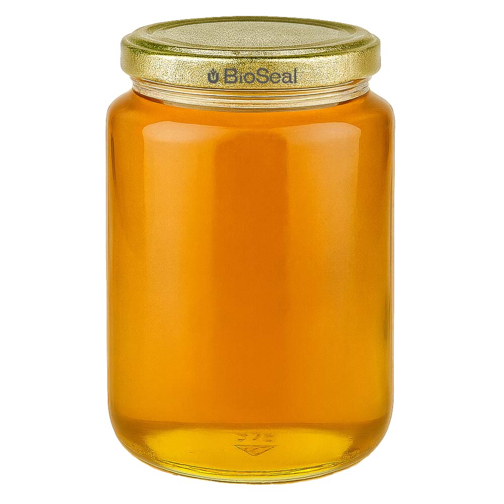 Stevige glazen honingpot van 1000 g met een elegant gouden deksel BioSeal UNiTWIST. Perfect voor honingverkoop, cadeausets en hoogwaardige presentaties.