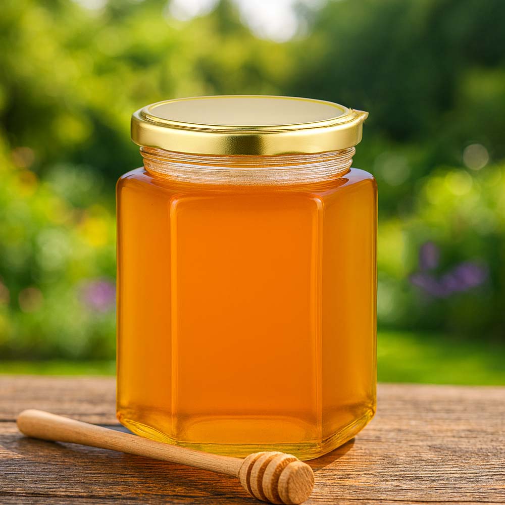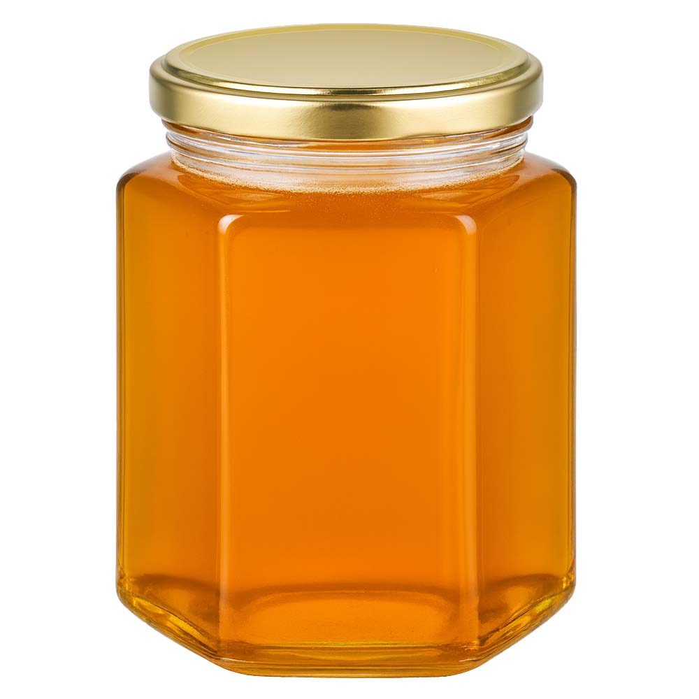 Stevige glazen honingpot van 250 g met een elegant gouden deksel BasicSeal UNiTWIST. Perfect voor honingverkoop, geschenken en professionele presentaties.