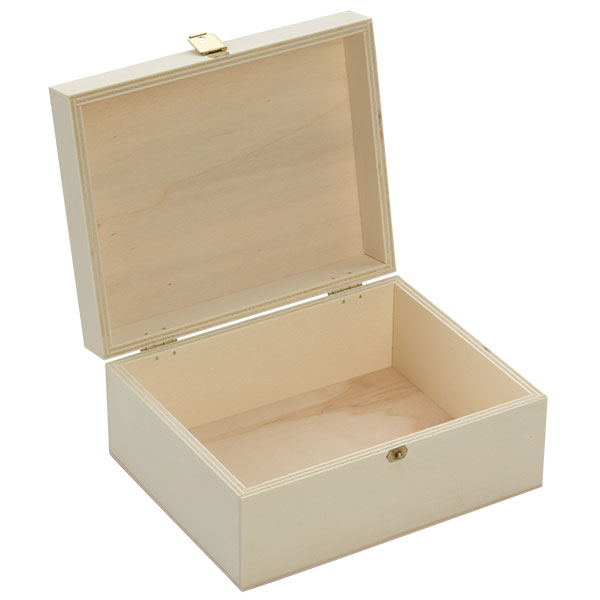 - Beschrijving: Deze zorgvuldig gemaakte box van populieren triplex heeft een klapdeksel met sluiting en 2 scharnieren. Ze meet buiten ca. 170x135x75mm (breedte/diepte/hoogte). De praktische kist is licht en dankzij hoogwaardig triplex toch zeer stabiel.
