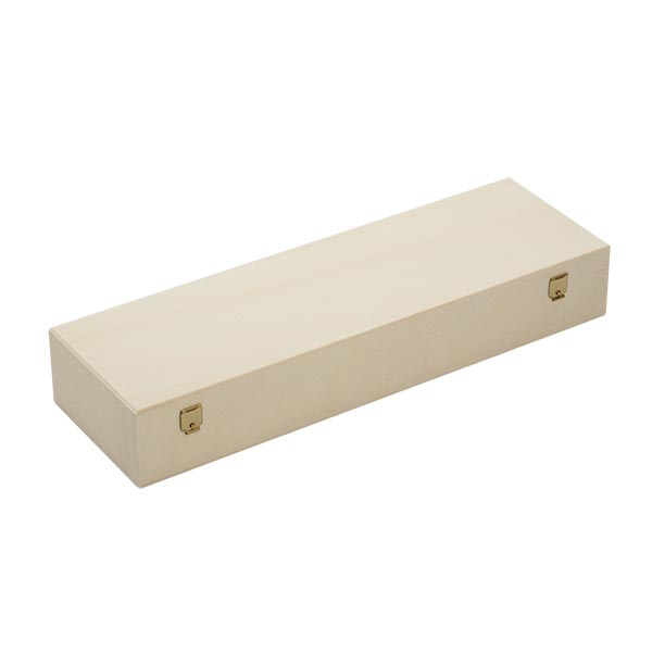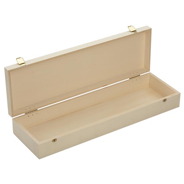 - Beschrijving: Deze zorgvuldig gemaakte box van populieren triplex heeft een klapdeksel met sluiting en 2 scharnieren. Ze meet buiten ca. 360x110x55mm (breedte/diepte/hoogte). De praktische kist is licht en dankzij hoogwaardig triplex toch zeer stabiel.