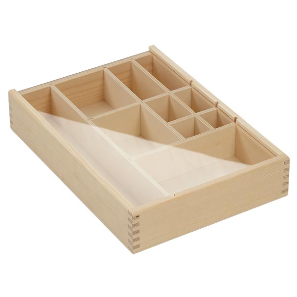 - Beschrijving: Deze zorgvuldig en hoogwaardig afgewerkte box van massief sparrenhout heeft een acryl deksel dat kan worden ingeschoven. Ze meet buiten ca. 340 x 240 x 63 mm (breedte/diepte/hoogte). De Memorybox heeft in totaal 10 interne compartimenten.