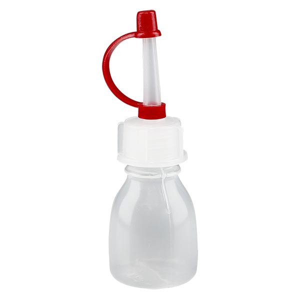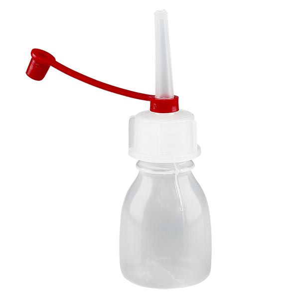 - Materiaal van de laboratoriumfles: LDPE blank. Ze is flexibel en goed in te drukken, maar beschikt toch over een goed vormbehoud.