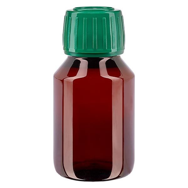 PET medicijnfles 50ml bruin (Veral fles) PP28, met groene OV