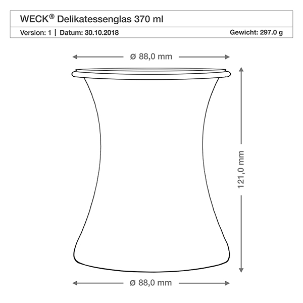 - Uitvoering: WECK-delicatessenglas 370ml met onderstuk, deksel, rubber ring en 2 klemmen
